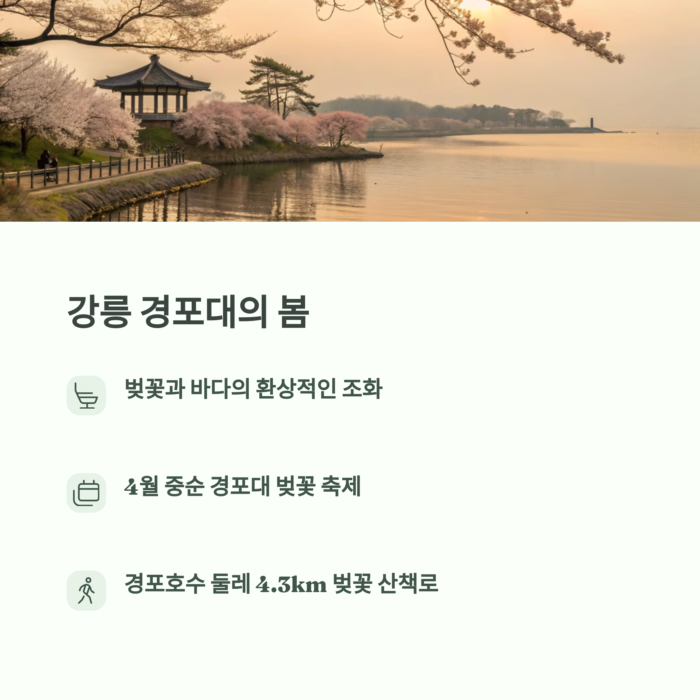 4월 중순에는 경포대 벚꽃 축제가 열리며, 벚꽃이 흩날리는 바닷가에서 인생샷을 남길 수 있습니다.📸